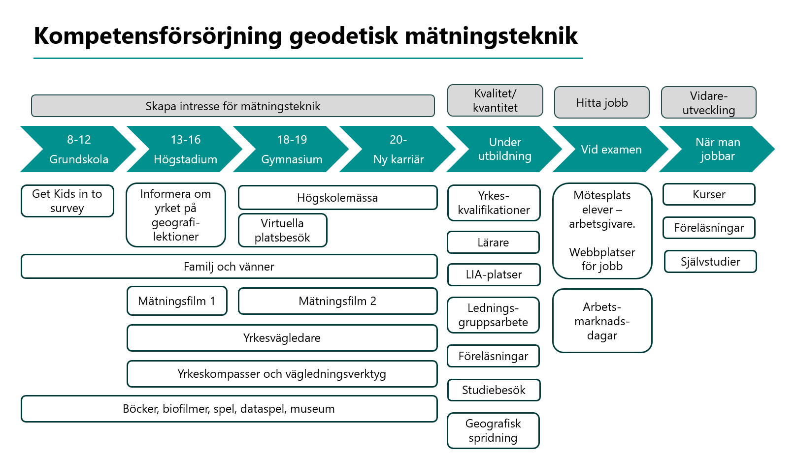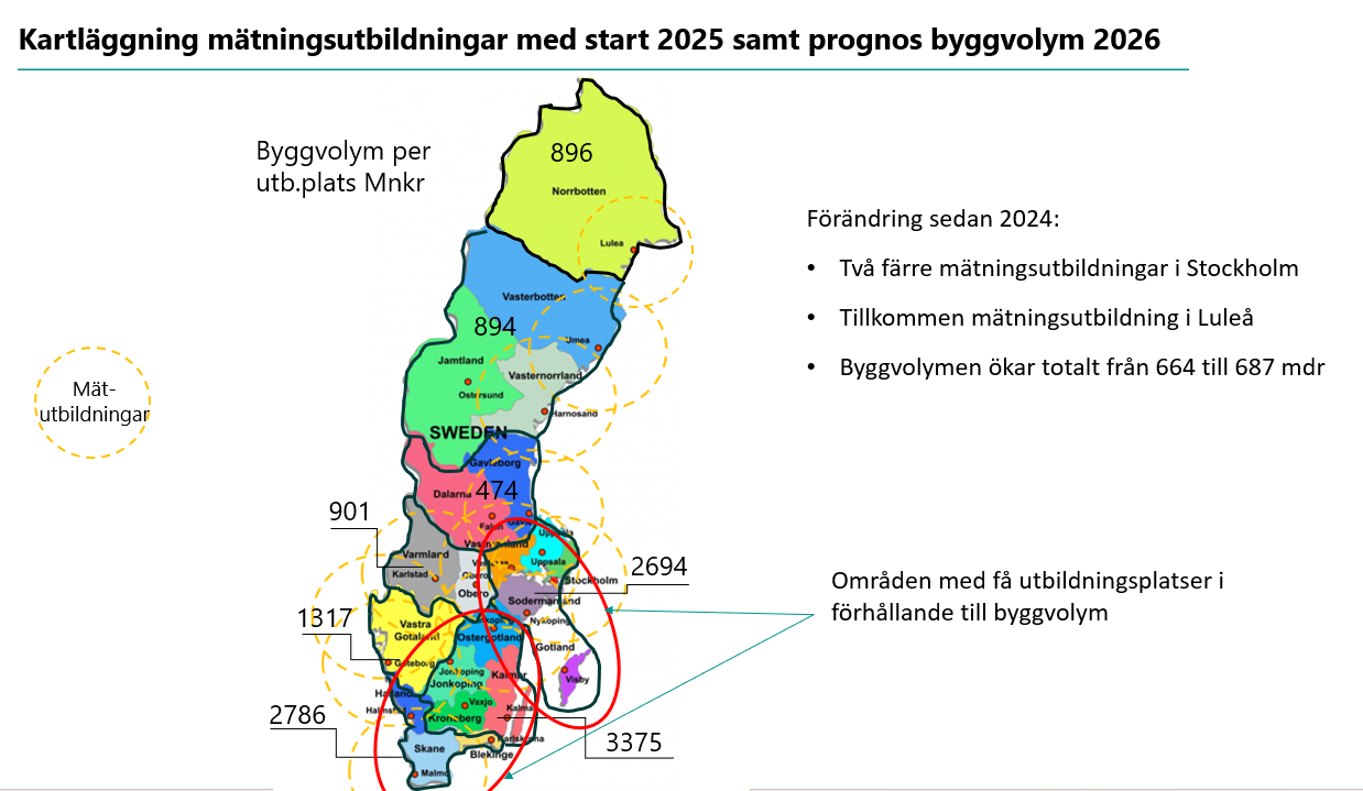 - Kartläggning hur stor byggprojektvolym och folkmängd i förhållande till utbildningsplatser på mätningsutbildningar (länk)