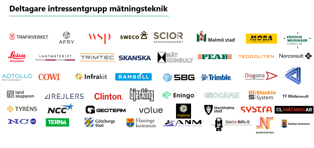 - Samlat ca. 50 privata företag, utbildningsanordnare, myndigheter och kommuner som tillsammans arbetar mätningstekniska frågor inom samhällsbyggnad